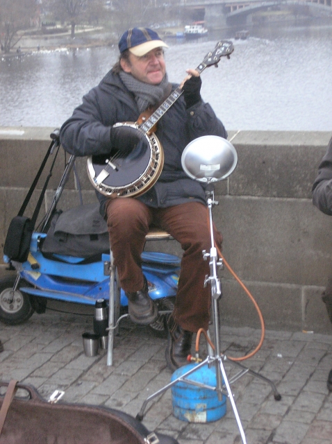 Druhý vynález banjisty na obrázku č.2, jinak velice příjemné partičky, mě ovšem zaujal ještě o něco více. Jeho důmyslný propan-butanový ohřívač prstů je prostě nepřekonatelný. Hned jak potkám Malinu, musím mu o něm říct. Takže kolegové muzikanti. Nezoufejte až dojde proud a bude kosa. Všechno jde, když se chce! Alespoň v Praze ano!
