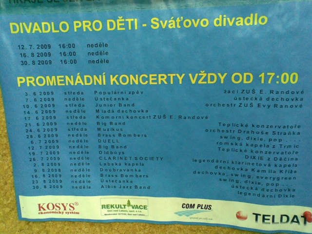Aby neujel vlak i vám tak vězte že, koncerty se budou konat každou neděli, pokud to přízeň počasí dovolí, až do konce srpna vždy od 17:00 hodin. Když si odmyslím i nějaké ty dechovky, což jak zpívá Petar Introvič "není můj vkus", myslím že by stálo za to juknou třeba na Brass Bombers 16.8. anebo na ústeckou klasiku Albis Jazz Band, což je poslední letošní promenádní koncert 30.8.